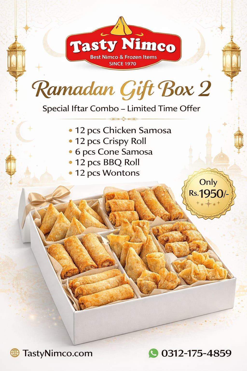 Order Ramadan Gift Box 2 from Tasty Nimco. Includes samosas, rolls, and wontons. Perfect Iftar combo. Fast delivery available.